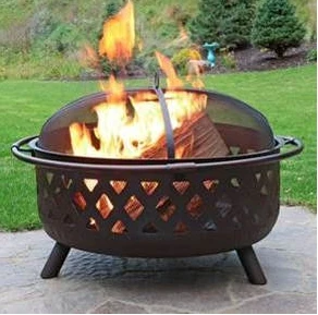 Large wood burning firepit with weave design that creates a rustic ambiance in your backyard.