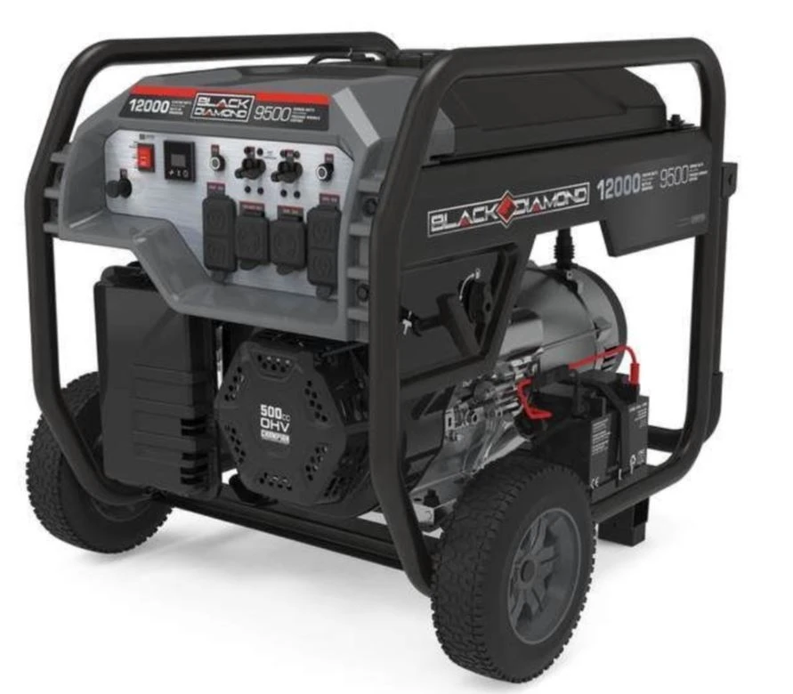 The Black Diamond BD100621 9500-Watt Portable Generator is designed with your safety and convenience in mind. A cost-effective solution that delivers power and peace of mind, this generator will provide all the backup power you need for power outages and emergencies. For projects, the 500cc single-cylinder OHV engine has what it takes to handle the multiple power tools and large equipment you need to get the job done. We have got convenience covered. You will appreciate the handy electric start with included battery, plus Cold Start Technology ensures a quick start in cold weather. The Intelligauge with Power Meter monitors voltage, frequency and operating hours, while the foldaway U-shaped handle and never flat tires make it a cinch to move your power where you need it.