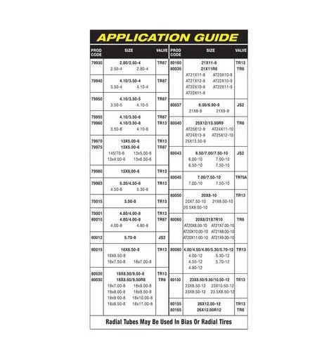 Use guide to left to find correct inner tube. Product Code equals Model Number.