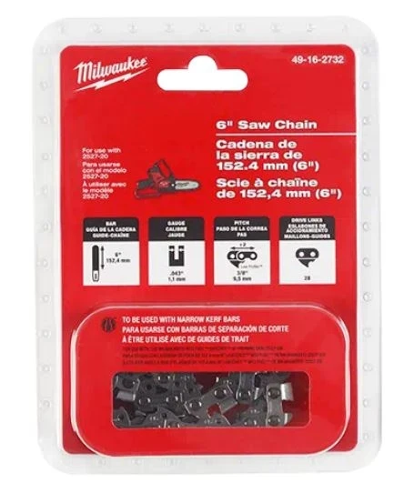 Our 6″ Saw Chain is for use with the MILWAUKEE® M12 FUELâ„¢ HATCHETâ„¢ 6″ Pruning Saw (2527-20). The Full House Chain features a cutter on every drive link, which minimizes vibration and delivers clean cuts. The design also delivers fast cuts and minimizes kickback to meet the ANSI B175.1 Standard. The saw chain has a durable design and is weather-resistant for increased life.