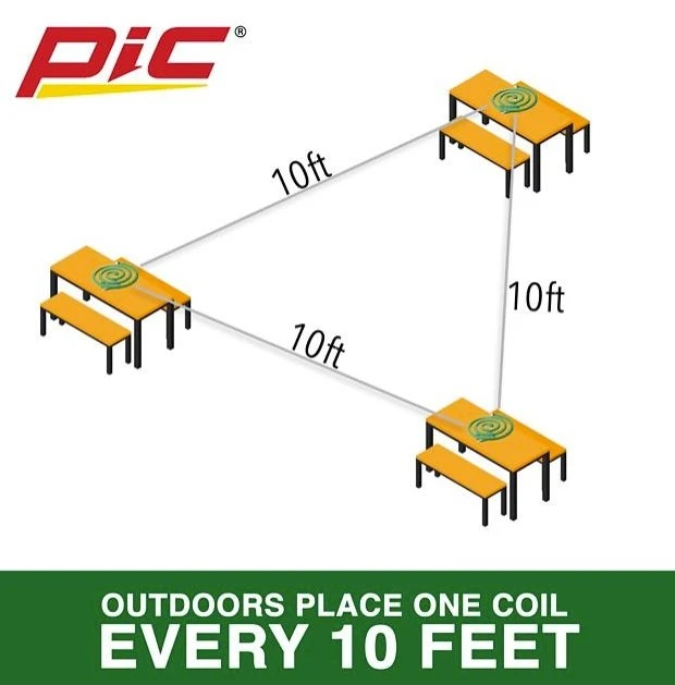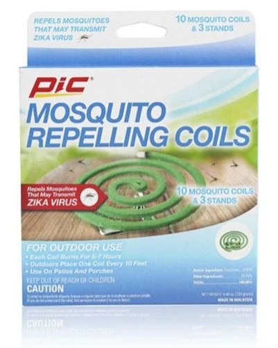 PIC C-10-12 Mosquito Repellent Coils repel mosquitoes that may transmit Zika Virus and have been a trusted product since 1953. These mosquito control coils are perfect for patios and porches – just set them outdoors every 10 ft. for best results. Each mosquito repellent coil will burn for 5-7 hours total, or small pieces can be broken off and used for shorter lengths of time.