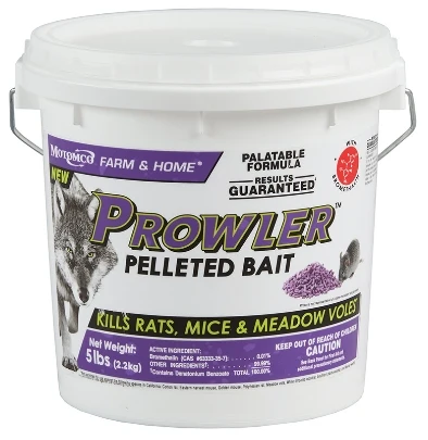Prowler rodenticides, exclusively from Motomco, are formulated to control even the toughest infestations on farms and agricultural operations. Prowler baits fuse the proven, acute active Bromethalin with proprietary ingredients to create formulas designed to maximize palatability and bait acceptance. Using Motomco’s newest method for active ingredient synthesis, Prowler uses Bromethalin to achieve results with less bait compared to anticoagulants. Prowler Pelleted Bait provides additional flexibility and are labeled for use in rat burrows beyond 100 ft of buildings.