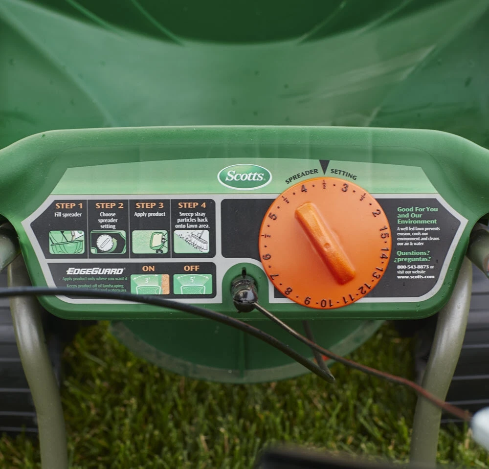 Use the Scotts Turf Builder EdgeGuard DLX Broadcast Spreader to apply grass seed and fertilizer in spring, summer or fall. The large hopper holds up to 15,000 sq. ft. of Scotts Lawn Care Products and is delivered ready to use and pre-calibrated; no assembly required
