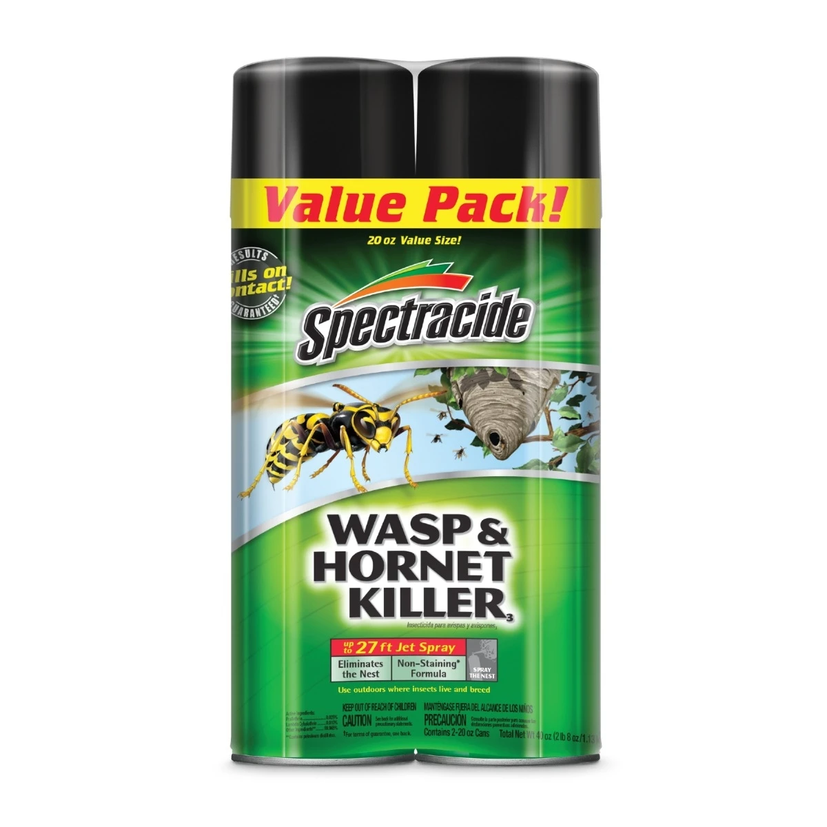 Spectracide Wasp & Hornet Killer aerosol eliminates wasp and hornet nests with a jet spray that reaches up to 27 feet. This twin pack contains 2-20 ounce cans. Use this product outdoors where insects live and breed. This product’s powerful spray will also kill insects that return to the nest over the next few days. The non-staining formula can be used around most home siding depending on age and cleanliness (see product label for details). Also controls tent caterpillars, scorpions and ants. To control wasps, hornets and yellowjackets, spray at sunset when these insects are least active. Stand a safe distance from the nest – don’t stand directly underneath. If it’s windy, stand with the wind at your back to avoid spray drift. Spray the nest until soaked. Wait at least 24 hours before removing the nest. Do not use this product in or on electrical equipment due to the possibility of shock hazard.