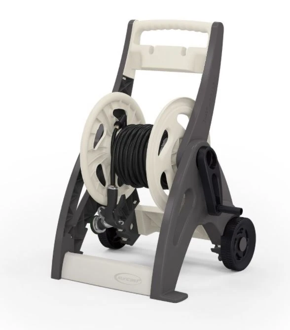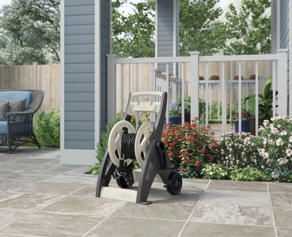 The Hosemobile® Hose Reel Cart by Suncast® holds up to 175 ft. of standard 5/8 in. hose. Our Slide Trak® technology assists in an even rewind and unwind, preventing the hose from building up on one side of the reel. The built-in wheels also make it easy to transport through your garden. This hose reel cart is constructed of durable weather-resistant resin material that is easy to maintain. Portable, functional and built to last, you can’t ask for much more in a hose reel storage solution.