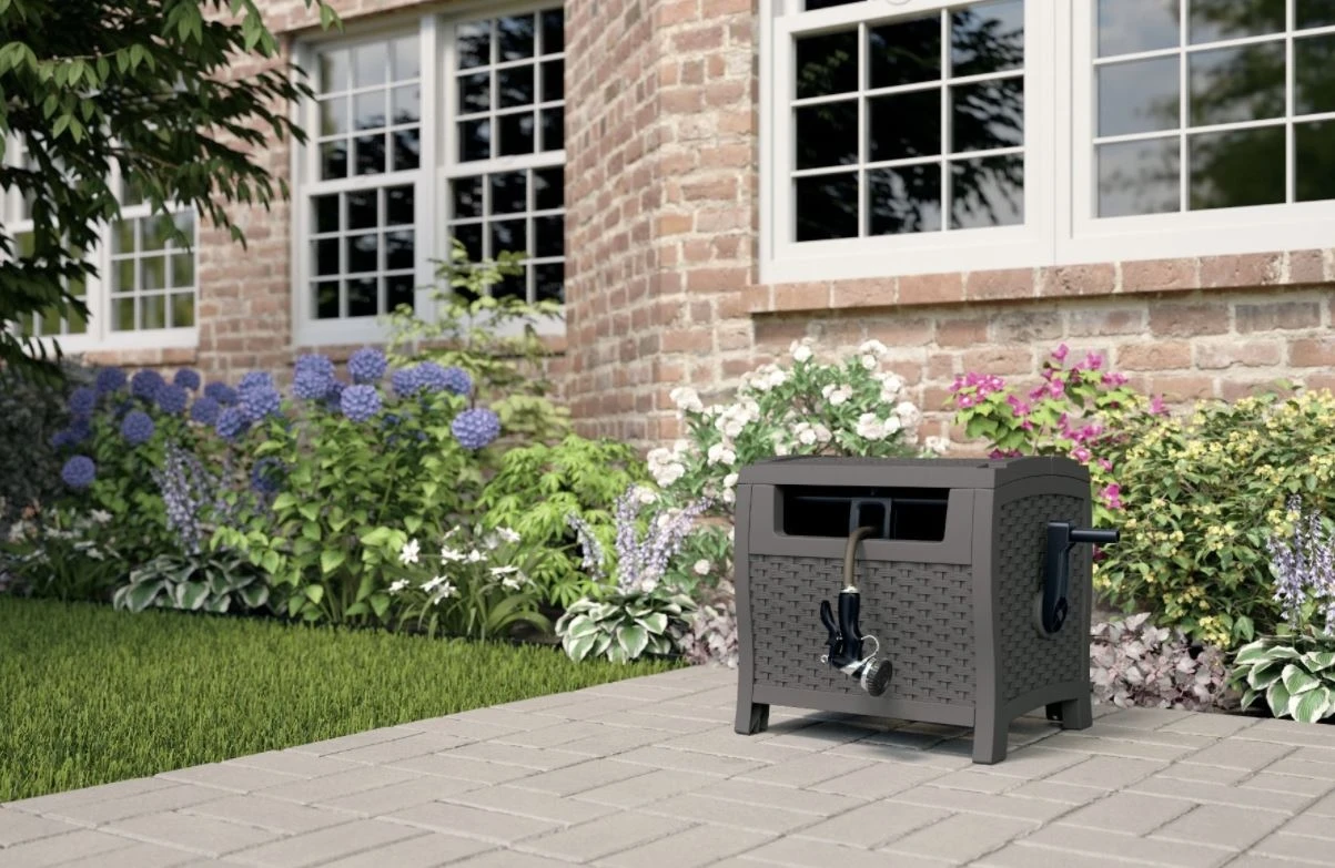 Keeping your garden hose neat and organized is a cinch with the Suncast® Slide Trak® Hose Hideaway®. The beautiful wicker pattern will complement any garden décor and the durable resin construction is built to last. Featuring our Slide Trak® Hose Guide you can manually wind your hose evenly without having to get your hands dirty.