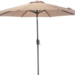 Retreat from the heat with this J & J Global 9′ Market Umbrella with Tilt Crank. A great addition to any patio or outdoor space! The canopy provides shade from the sun and is constructed of 180g polyester, featuring venting for stability in wind, and is supported by a sturdy steel frame with a durable black powder coated finish. A hand crank raises and lowers the umbrella, while the push-button tilt gives you the ability to set your desired angle for the canopy, making it easy to adjust.