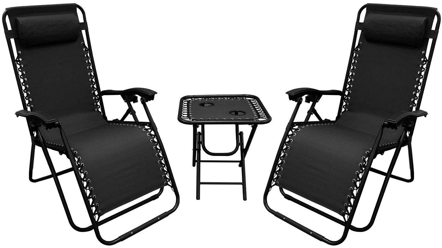 Reclining in the zero-gravity support chair distributes weight and helps alleviate pressure for a relaxing, floating sensation. The chair’s durable steel frame provides stable support, while its sturdy padded surface upholstered in oxford fabric offers cushioning comfort. Cup holders in the chairs and side table keep drinks cool and handy. The chair’s removable pillow can be used behind the head or lower back. The chairs and side table fold to a compact size for convenient storage or transport.